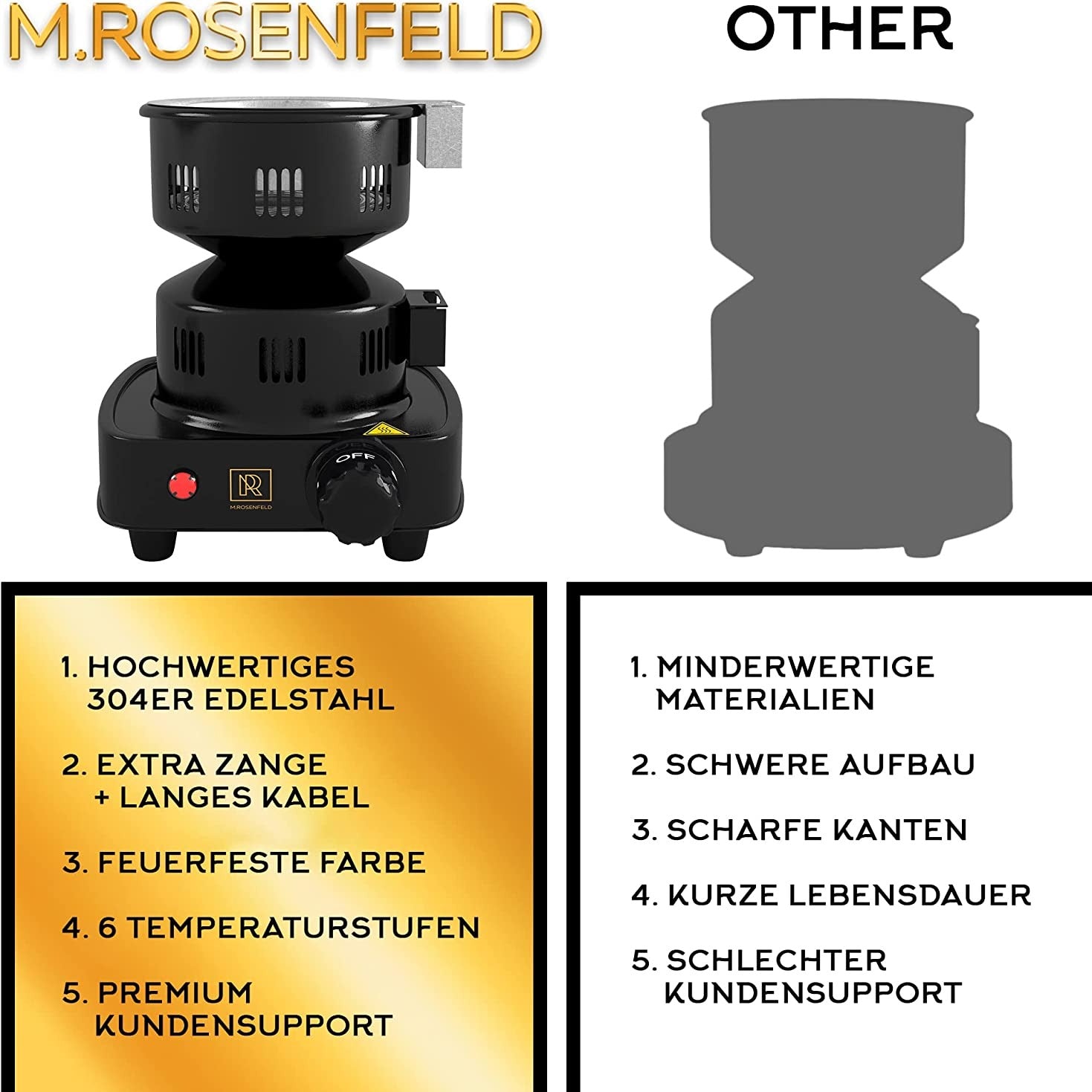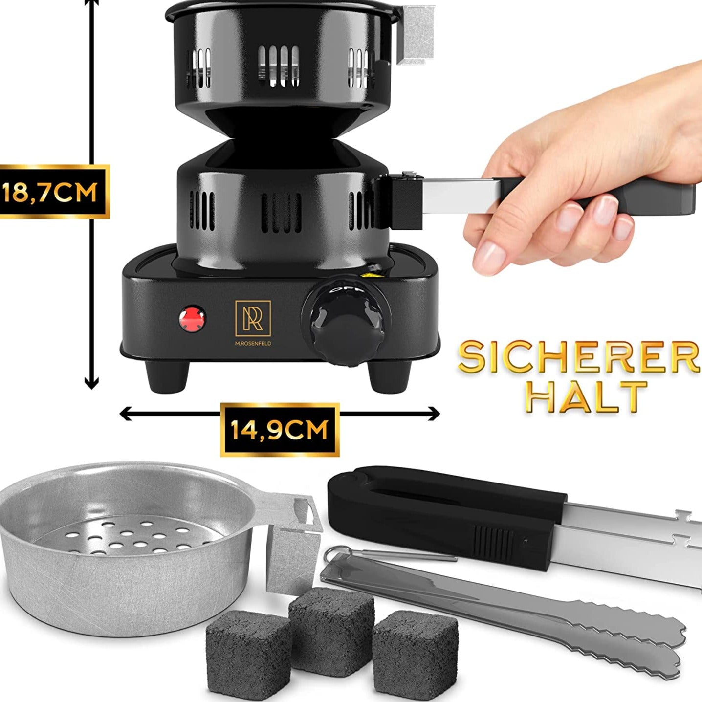 - ✅ 𝗘𝗗𝗟𝗘𝗦 𝗞𝗢𝗠𝗣𝗟𝗘𝗧𝗧 𝗦𝗘𝗧: Mobile charcoal basket & extra charcoal tongs (for tobacco and charcoal) made of high-quality stainless steel + DE instructions for use. Everything in elegant packaging by M. ROSENFELD in black and gold!