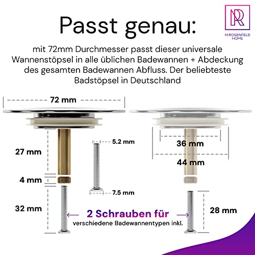 - ✅ 𝗣𝗔𝗦𝗦𝗧 𝗚𝗘𝗡𝗔𝗨: mit 72mm Durchmesser passt dieser universale Wannenstöpsel in alle üblichen Badewannen + Abdeckung des gesamten Badewannen Abfluss. Der beliebteste Badstöpsel in Deutschland